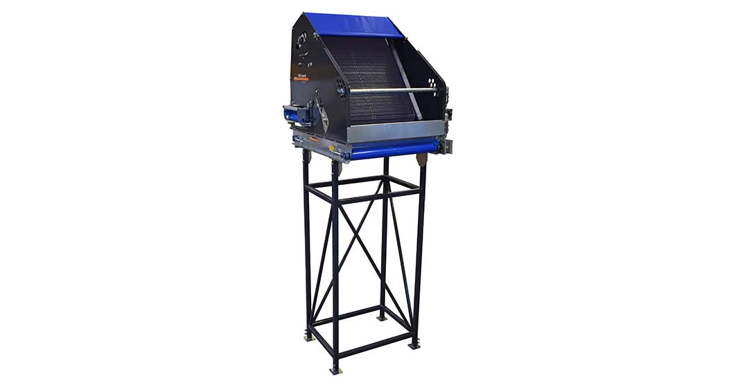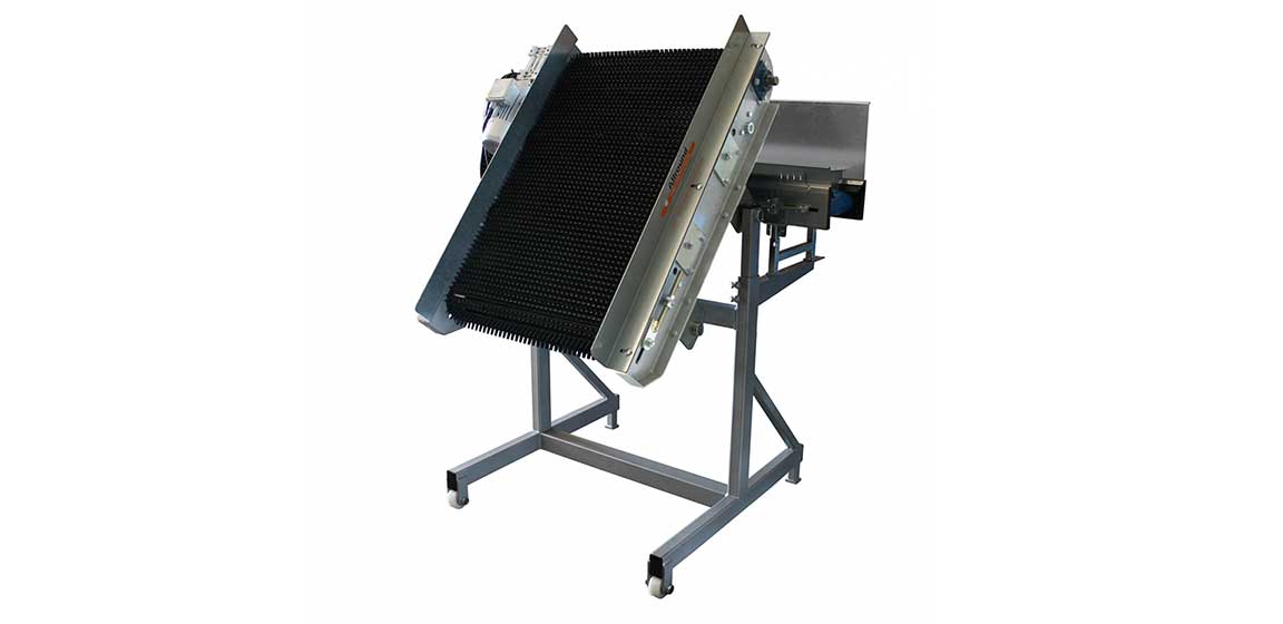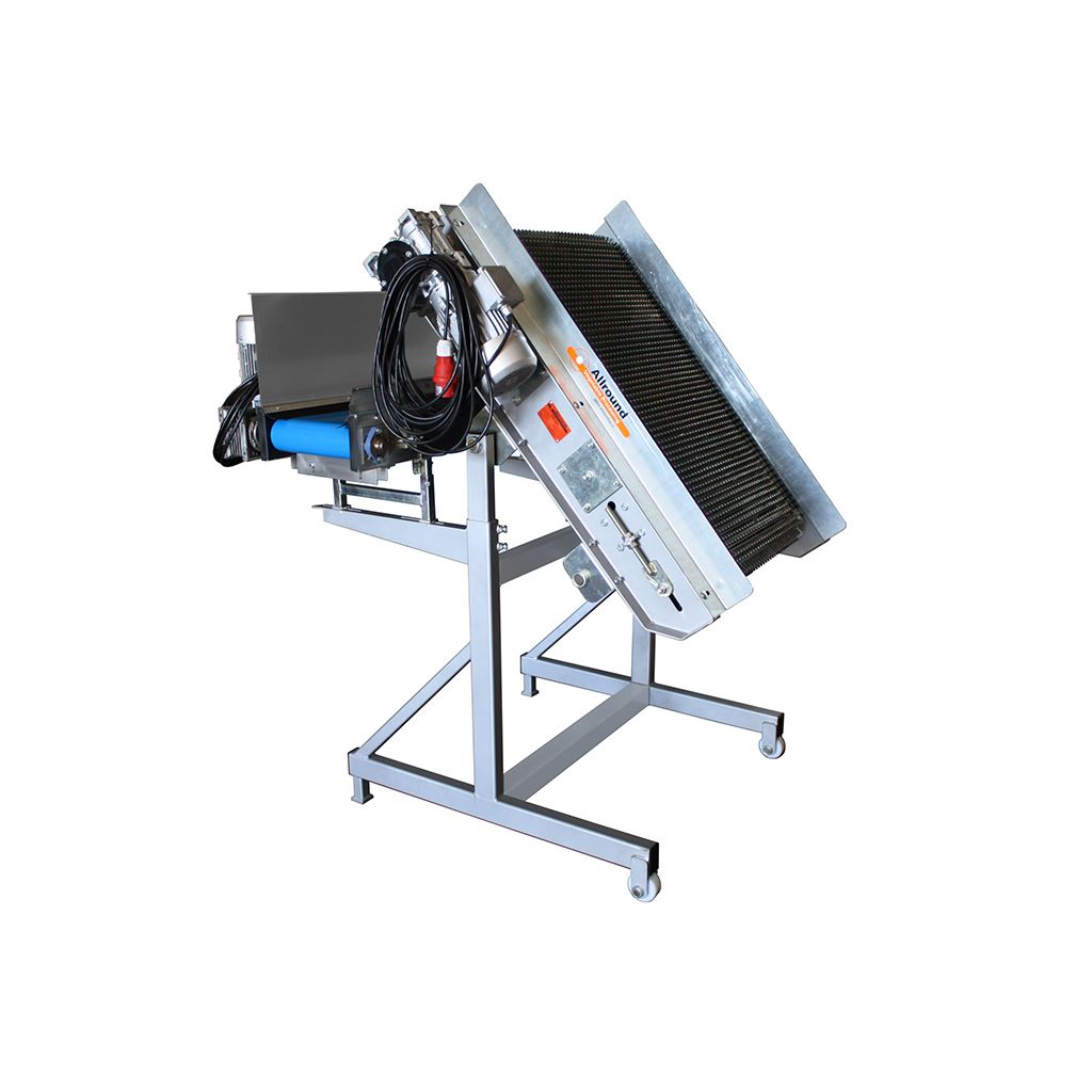 死多才多艺的Krauttrenner毛皮Gemuseverarbeitu死去ng trennt Blätter sehr vorsichtig von Karotten. Dies geschieht durch einen rotierenden Riemen, an dem Blätter befestigt sind. Das rotierende Band ist in einem steilen Winkel angeordnet, wodurch die Blätter nach oben transportiert werden und das schwerere Produkt herunterfällt. Nachdem die Produkte von den Blättern getrennt wurden, kann das Produkt mit einem Transportband oder direkt in eine Allround-Maschine transportiert werden.
