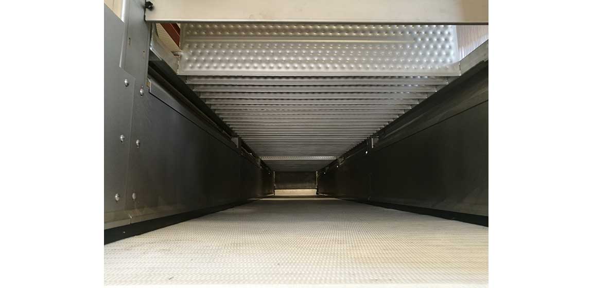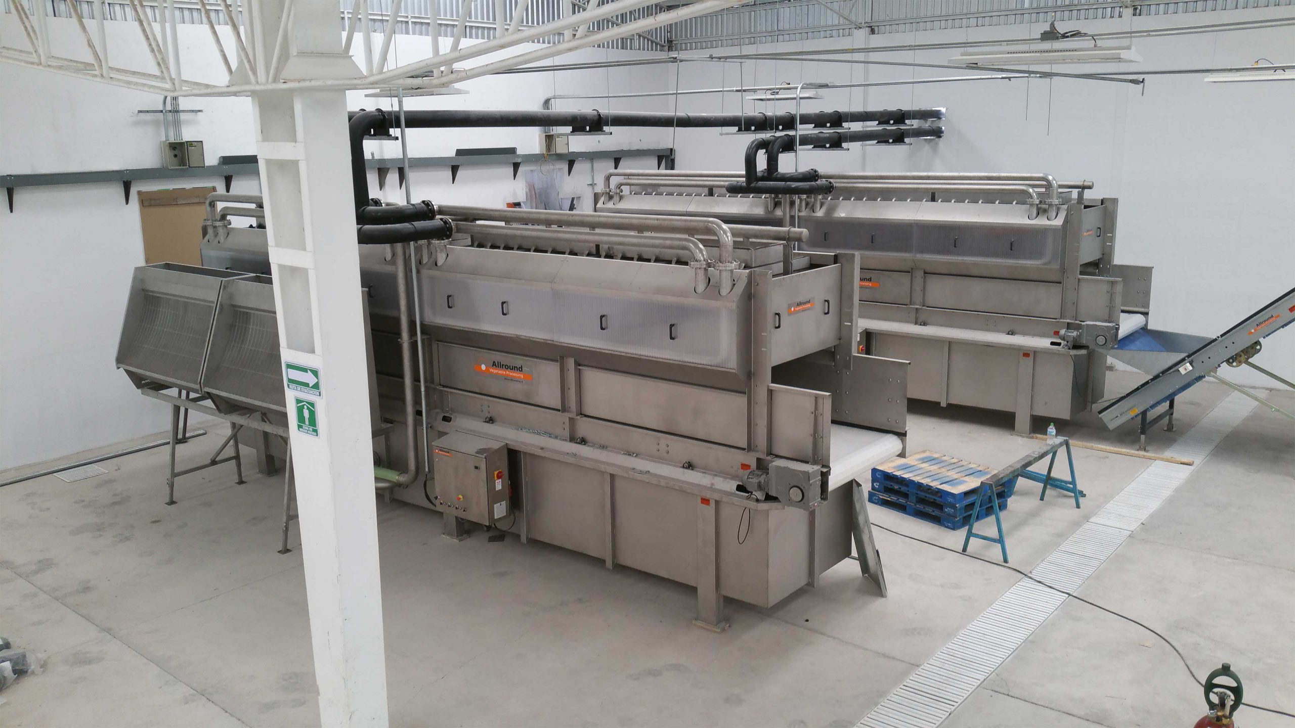 产品通过Intralox®冲洗网格运输,这是食品工业专用的开放式聚乙烯带。这条皮带包括所有类型的水冷机组为蔬菜和其他农产品。该冷却装置是一个“比泽尔”风冷冷凝装置与半封闭往复式压缩机,一个风冷Helpman冷凝装置。此外,对液体接收器进行了TÜV测试。